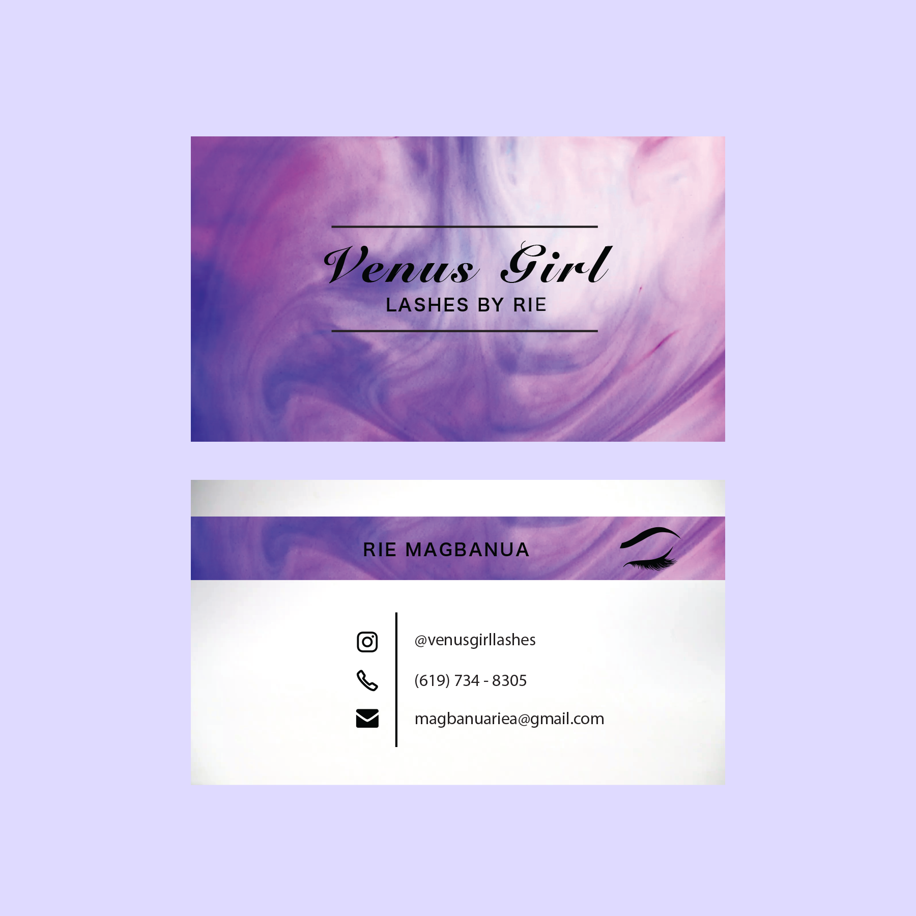 A logo created for Venus Girl Lashes and the company's card design. Created using Illustrator.